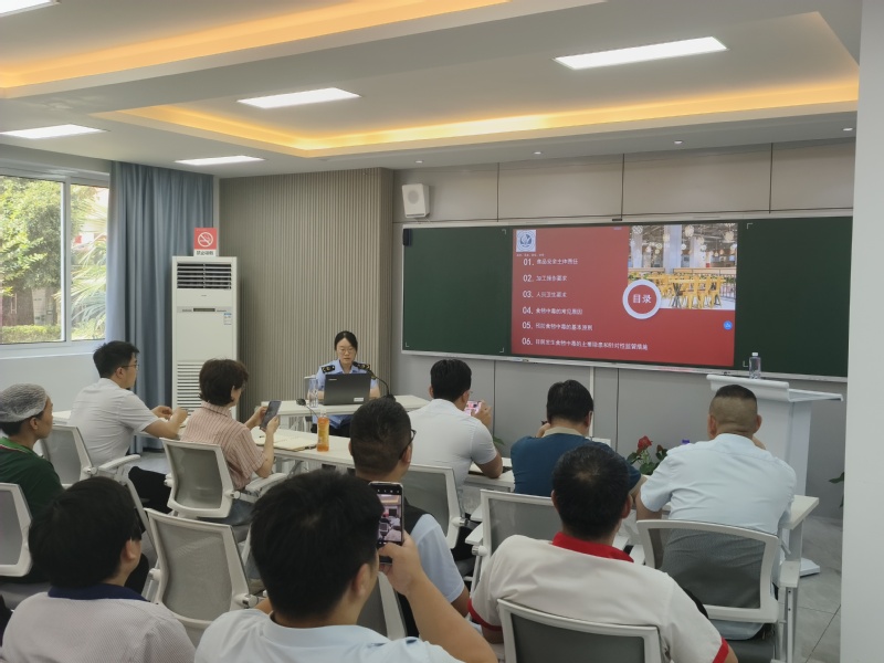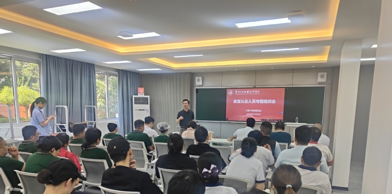 在随后举行的食堂从业人员专题培训会上,乔楠围绕食品安全主体责任、加工操作要求、人员卫生要求、食物中毒的常见原因、预防食物中毒的基本原则、目前发生食物中毒的主要隐患和针对性监管措施等六个方面结合实际案例进行了全面讲解,从而进一步规范了学校食堂管理流程。