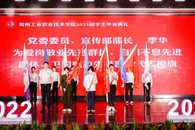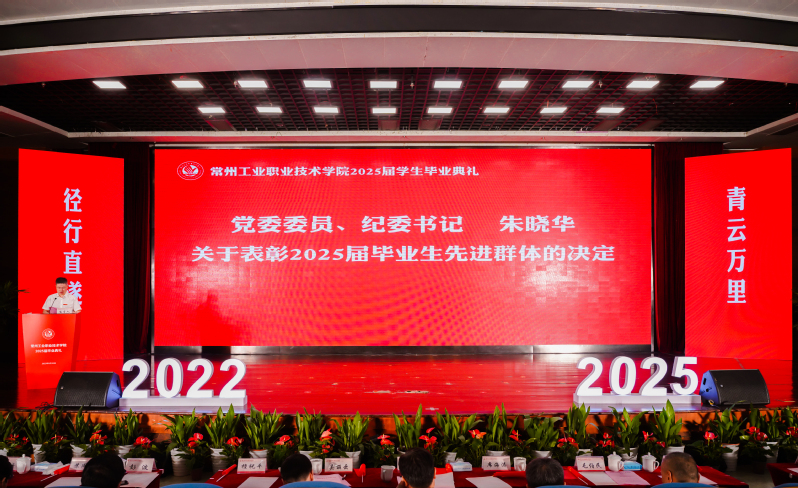 党委副书记毛伯民宣读了《关于表彰2025届优秀毕业生的决定》。党委委员、副校长吴丽云宣读了《关于聘任2025届校友联络员的决定》。党委委员、纪委书记朱晓华宣读了《关于表彰2025届毕业生先进群体的决定》。党委委员、宣传部部长季华为“爱岗敬业”先进群体、“自强不息”先进群体、“卫国戍边”先进群体代表授旗。