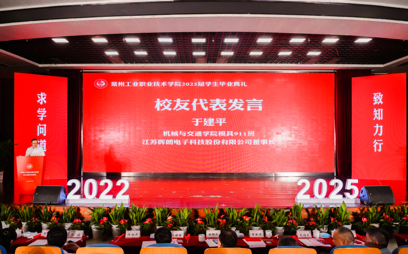 机械与交通学院1995届模具911班毕业生、江苏晖朗电子科技股份有限公司总经理于建平作为校友代表向学弟学妹们讲述了自己毕业三十年的奋斗历程。他希望学弟学妹们以“金品”铸魂,以“金技”立身,以“金创”破界,以“金诺”致远,以“金晖”报国,让青春在制造强国的星辰大海中闪光。