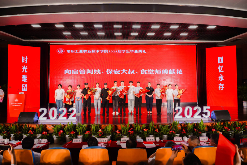 毕业典礼还举行了学生献唱以及毕业生代表向教师、班主任、辅导员代表、宿管阿姨、保安大叔、食堂师傅献花等活动。