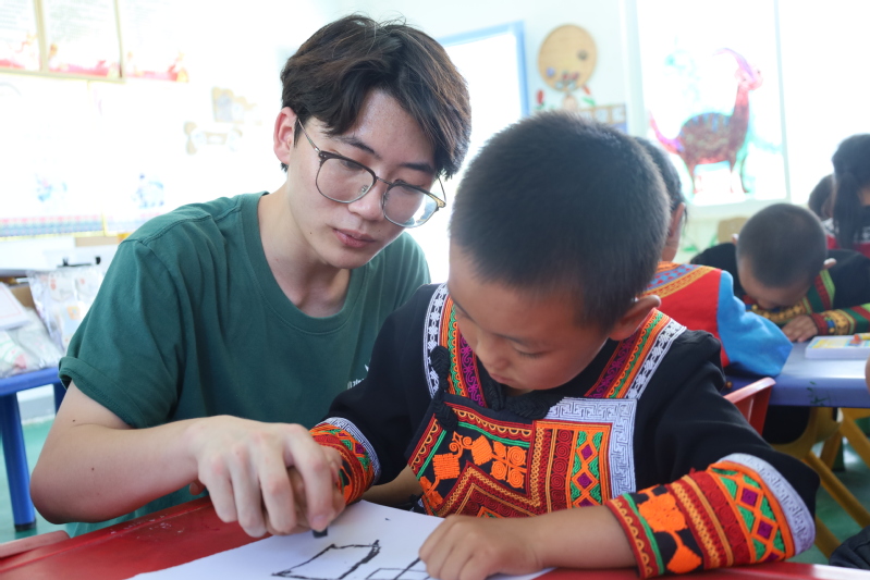 熟悉的村寨和群山再次迎来志愿者的身影,孩子们的脸上洋溢着喜悦。在幼教点的院子里,一系列精心设计的活动有序展开。志愿者杜坤组织孩子们围坐在一起,生动讲述国旗知识。孩子们好奇地触摸着五星红旗,认真聆听关于祖国的故事,清澈的眼神中流露出对“祖国”的初步认知和向往。在志愿者吕彤彤、王晴的带领下,孩子们拿起画笔和剪刀,在纸上描绘心中的梦想。创作过程中,孩子们将五彩斑斓的图案与彝族特色纹样巧妙结合,民族文化在互动中悄然传递。志愿者吕思婉教唱歌曲《我和我的祖国》,孩子们用清亮的童声认真学唱,稚嫩而饱含深情的歌声在幼教点回荡,传递着纯真的爱国情感。