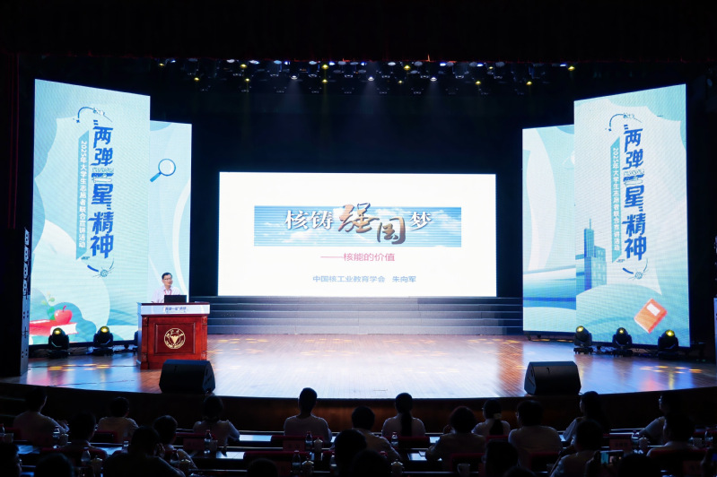分享会上,我校爱心驿站“两弹一星”志愿宣讲团代表陈俞同同学介绍了近年来团队在“两弹一星”精神宣讲上所取得的成绩和实践经验,引发在场师生的深入讨论。当晚,“两弹一星”精神大学生志愿者联合宣讲汇演精彩上演,中国工程院院士邱爱慈院士在《“两弹一星”精神——马兰精神》主题报告中,深入阐述了马兰精神与“两弹一星”精神的深刻内涵及其在当代科技发展中的实践意义;中国核工业教育学会秘书长朱向军向现场所有师生讲述了《核能的价值》;华东地区高校宣讲团、中国核工业集团有限公司宣讲团以文艺展演的形式让“两弹一星”精神更加鲜活生动。