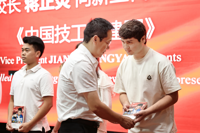 蒋正炎为新生代表赠送校本教材《中国技工邓建军》,鼓励同学们学习“中国工匠精神”,在专业学习和实践中不断超越自我。学工处处长邢凯岭为新生代表颁发新生奖学金,希望大家志存高远、勤学笃行,在常工业实现人生的新跨越。