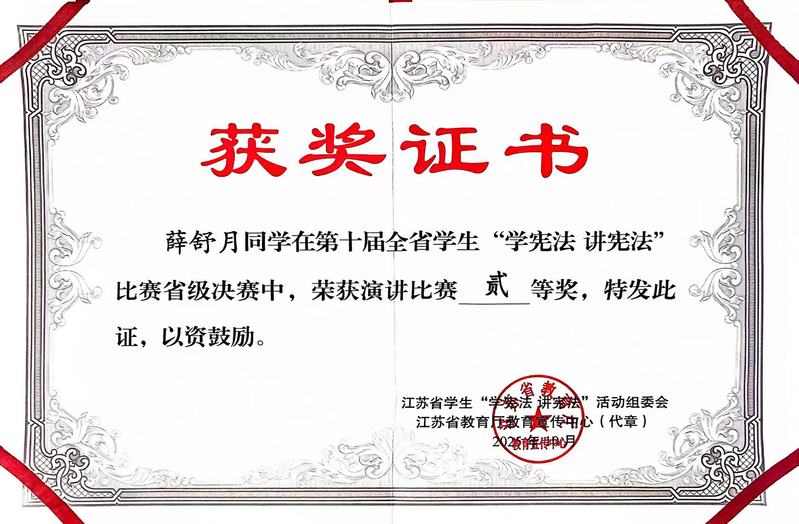 此次赛事竞争激烈,历经校赛选拔推荐、省级初赛的层层筛选,最终薛舒月同学从百余位高校组参赛者中脱颖而出,成功跻身省级决赛。决赛设置主题演讲与即兴演讲两大核心环节,全面考察选手的宪法认知深度、语言表达能力与临场应变水平。在主题演讲环节,薛舒月以《宪法之光 守护成长》为题,将真挚情感与深刻思考融入演讲之中,以情带声、以思促讲,用生动的表达传递宪法精神。在极具挑战性的即兴演讲环节,她沉着冷静、思路清晰,围绕“法治宣传在家庭、学校与社会生活中的法律实践”展开精准论述,逻辑严密、语言流畅,展现出对宪法精神的深刻理解与扎实的法治素养。