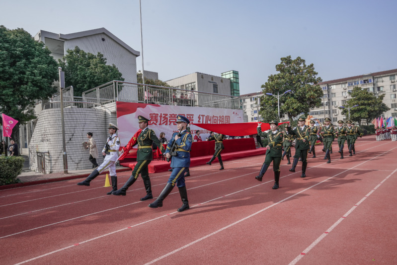开幕式现场,我校国旗护卫队队员身着统一制服,迈着铿锵有力的步伐入场。他们精神抖擞、目光坚定,动作整齐划一,从列队、护旗到升旗,每一个环节都严谨规范、庄重肃穆。伴随着雄壮的《义勇军进行曲》,五星红旗冉冉升起,在场师生纷纷行注目礼,现场氛围庄重而热烈。队员们用过硬的队列素质和饱满的精神状态,赢得了学校师生的阵阵掌声。