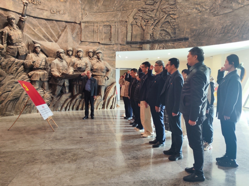 在纪念馆广场的革命先烈雕塑前,面对鲜红的党旗,全体党员庄严列队,由机关党总支第三党支部书记郝福锦领誓,一同重温入党誓词。“我志愿加入中国共产党……”铿锵有力的誓言在空中回荡,表达了同志们为党的事业奋斗终身的坚定决心。