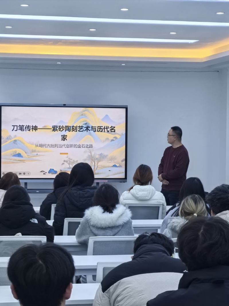 11月19日,常州市工艺美术大师张毓阳应邀为我校艺术创意学院2025级学生开展“刀笔传神——紫砂陶刻艺术与历代名家”专题讲座。讲座由艺术创意学院副院长唐一鑫主持。