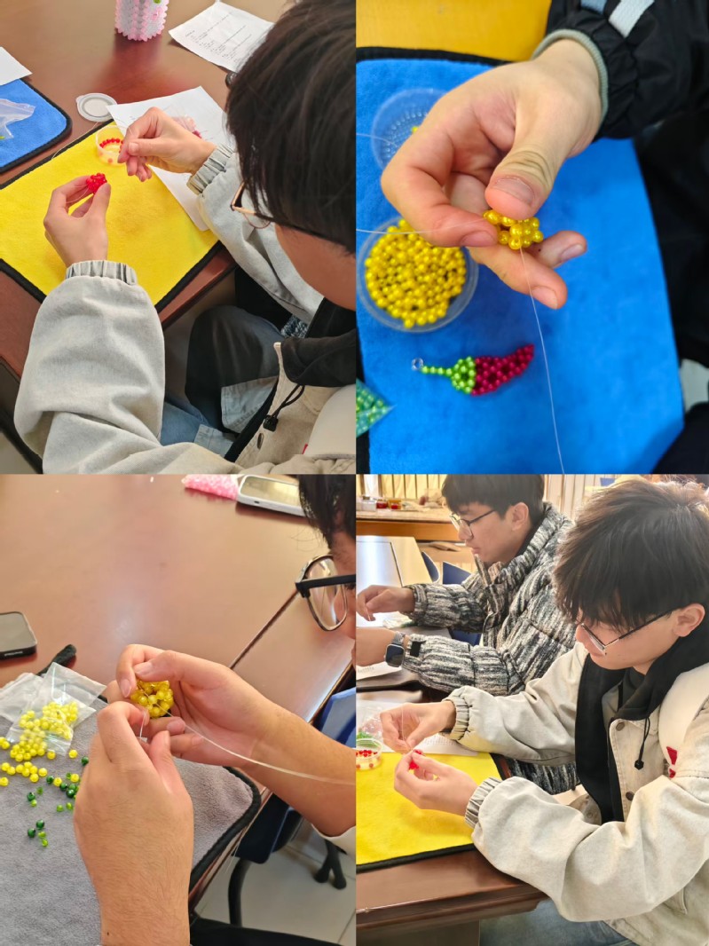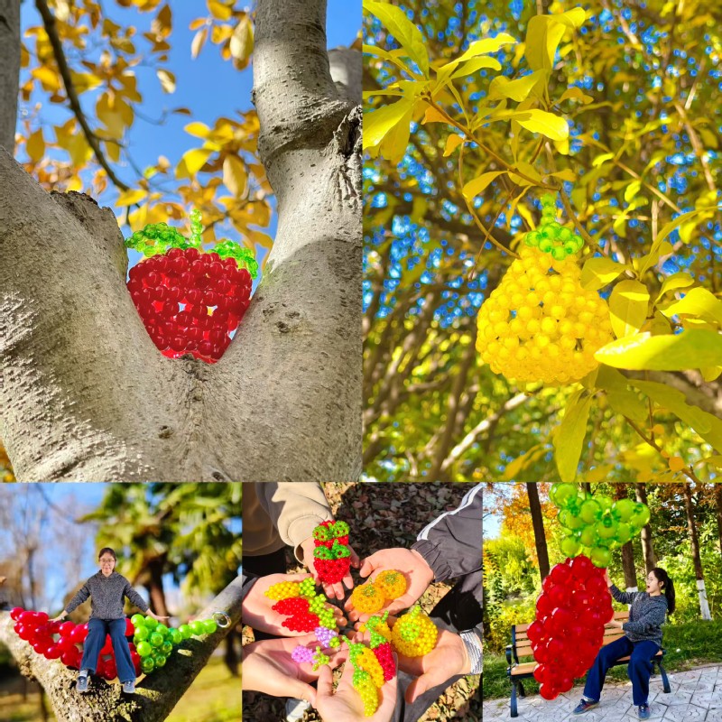 活动当天,新手在社团骨干的指导下掌握“十字穿珠法”,熟练者则挑战“立体叠编”技法,零散的彩珠在指尖化作鲜活的“果蔬艺术品”。更有创意之作将串珠果蔬串联成挂饰或摆件,置于校园秋景中,与黄叶蓝天相映成趣,成为“秋日限定风景”。