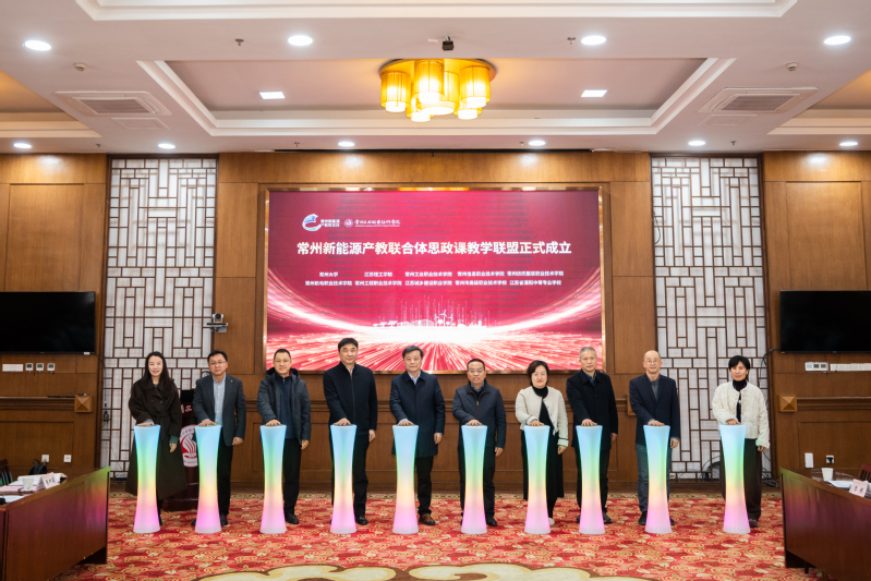 在全体与会人员的共同见证下,由我校牵头,常州大学、江苏理工学院、常州信息职业技术学院、常州机电职业技术学院、常州工程职业技术学院、常州纺织服装职业技术学院、江苏城乡建设职业学院、江苏省溧阳中等专业学校、常州市高级职业技术学校共同参与的“常州新能源产教联合体思政课教学联盟”正式成立。