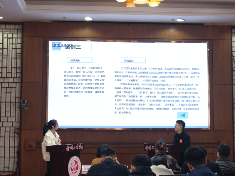 本次大赛遵循省赛规则,分为初赛(基础知识测试)、复赛(案例研讨)和决赛(谈心谈话)三个环节。初赛于11月13日举行,共有73名辅导员参赛。测试采用闭卷笔试作答方式进行,共有20名辅导员脱颖而出,进入复赛。复赛于11月28日举行,采用AB角问答方式进行。比赛以“我提问,你回答”的方式开展,由A、B选手围绕案例共同辨析对策、总结方法。辅导员们思路清晰、分析透彻,展现了应对复杂情境的专业素养与逻辑思辨能力,共有9名选手进入决赛。决赛于12月11日进行,在谈心谈话中,辅导员们情真意切、循循善诱,充分体现了对学生成长的深切关爱与教育智慧。