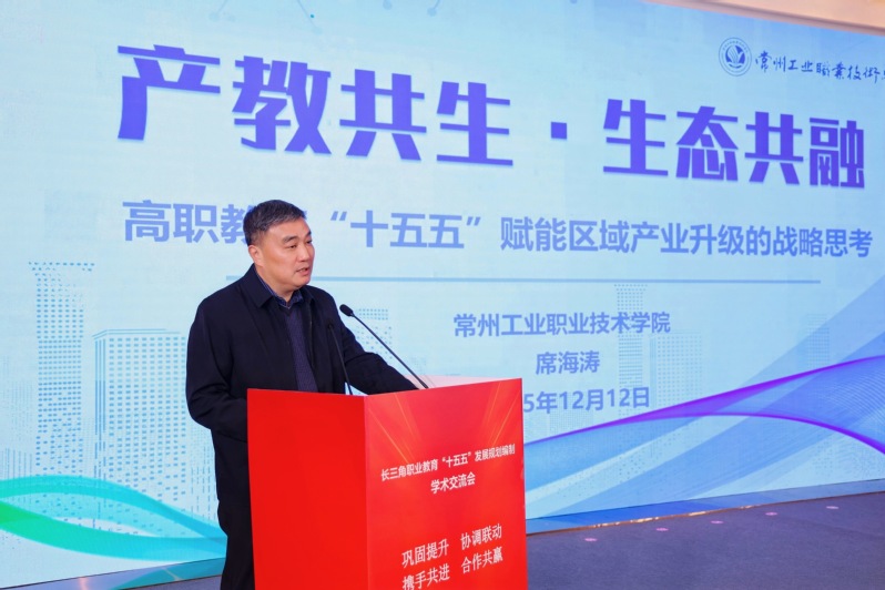 在主旨报告环节,我校党委书记席海涛作为长三角地区江苏高职院校代表,作《产教共生·生态共融——高职教育“十五五”赋能区域产业升级的战略思考》专题报告。他指出,“十五五”时期高职教育的核心使命在于紧密对接《教育强国建设规划纲要(2024-2035年)》文件要求,成为服务新质生产力发展的“主基地”、促进更高质量就业的“稳定器”、构建融通融合体系的“立交桥”、教育教学化转型的“先行区”以及服务国家战略的“助推器”。他通过对比长三角、粤港澳大湾区、京津冀等三大城市群数据,展现了长三角地区雄厚的产业基础与活跃的经济动能,特别是江苏高校资源丰富和一流企业集群的显著优势。