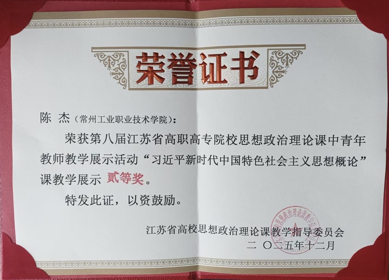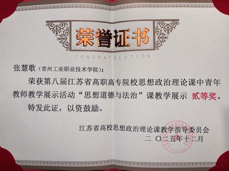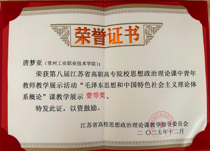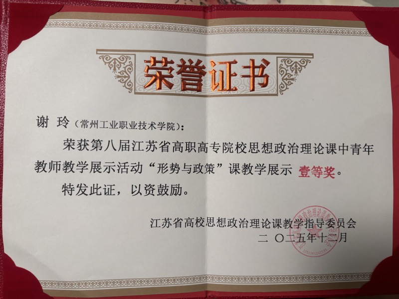 12月14日,第八届江苏省高职高专院校思想政治理论课中青年教师教学展示活动圆满收官。我校马克思主义学院教师凭借扎实的理论功底、精湛的教学技艺与出色的现场表现,在激烈竞争中脱颖而出,斩获佳绩:唐梦亚、谢玲老师分获“毛泽东思想和中国特色社会主义理论体系概论”“形势与政策”课程组一等奖,张慧歌、陈杰老师分获“思想道德与法治”“习近平新时代中国特色社会主义思想概论”课程组二等奖。