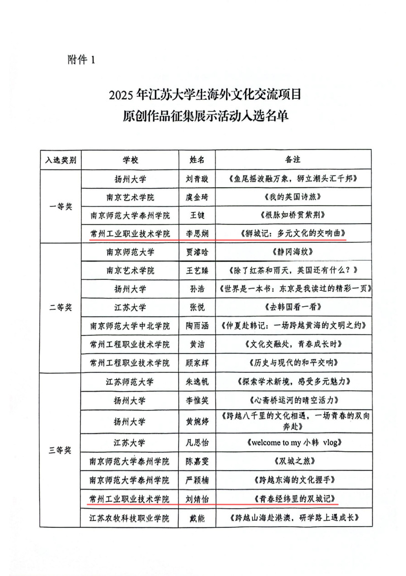 近日,2025年江苏大学生海外文化交流项目原创作品征集展示活动评选结果揭晓。我校学生凭借扎实的文化素养与鲜活的海外交流体悟,在活动中脱颖而出,共有2件作品获奖。
