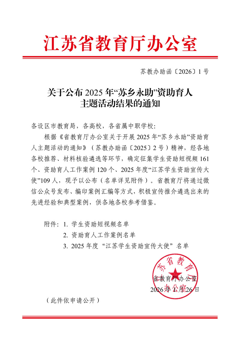 近日,江苏省教育厅公布了2025年“苏乡永助”资助育人主题活动评选结果。我校在学生资助短视频、资助育人工作案例及学生资助宣传大使三个项目中全部获选。